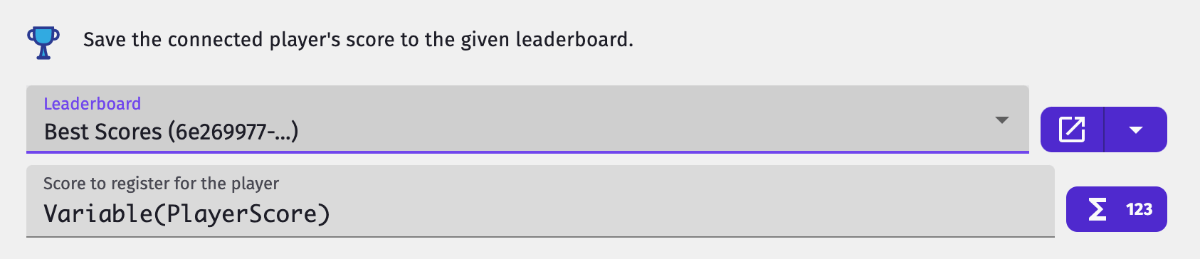 - Once it is done, you can either select the leaderboard you want to send the score to, or use an expression to define the unique id of the leaderboard (if it is stored in a scene variable for instance).