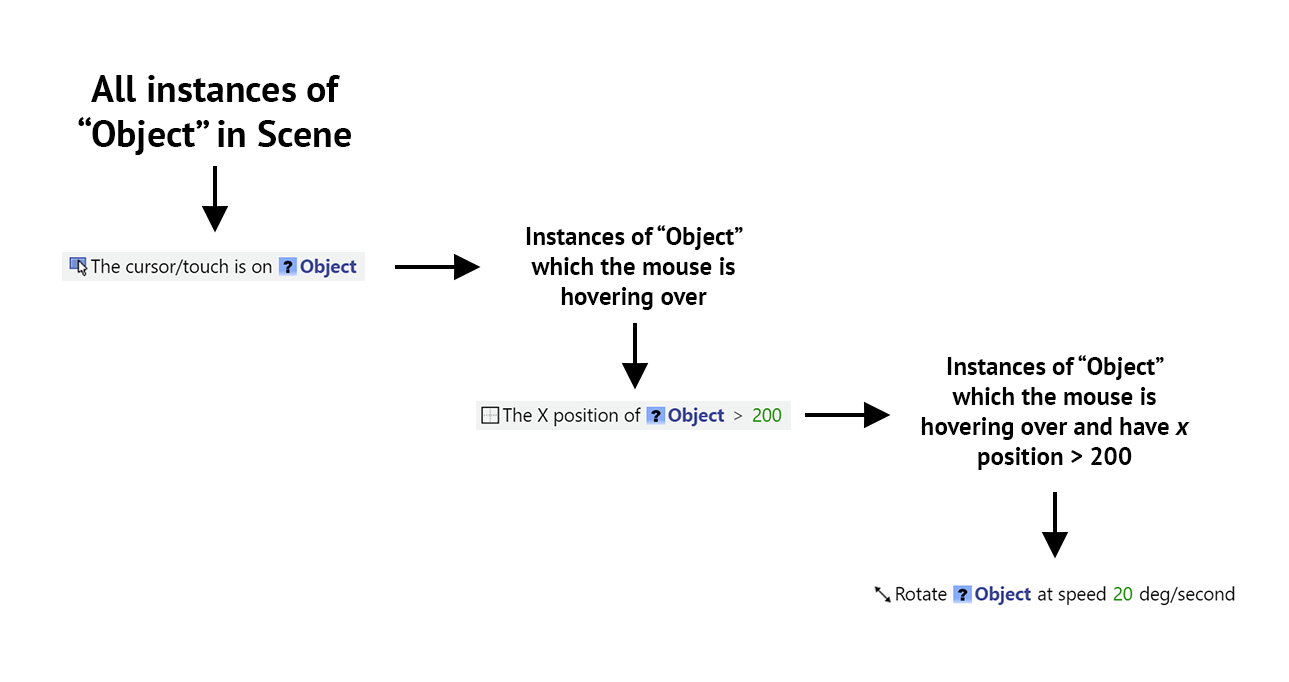 - A condition that uses an object as parameter will only pick for the conditions and actions following it objects that meet said condition.