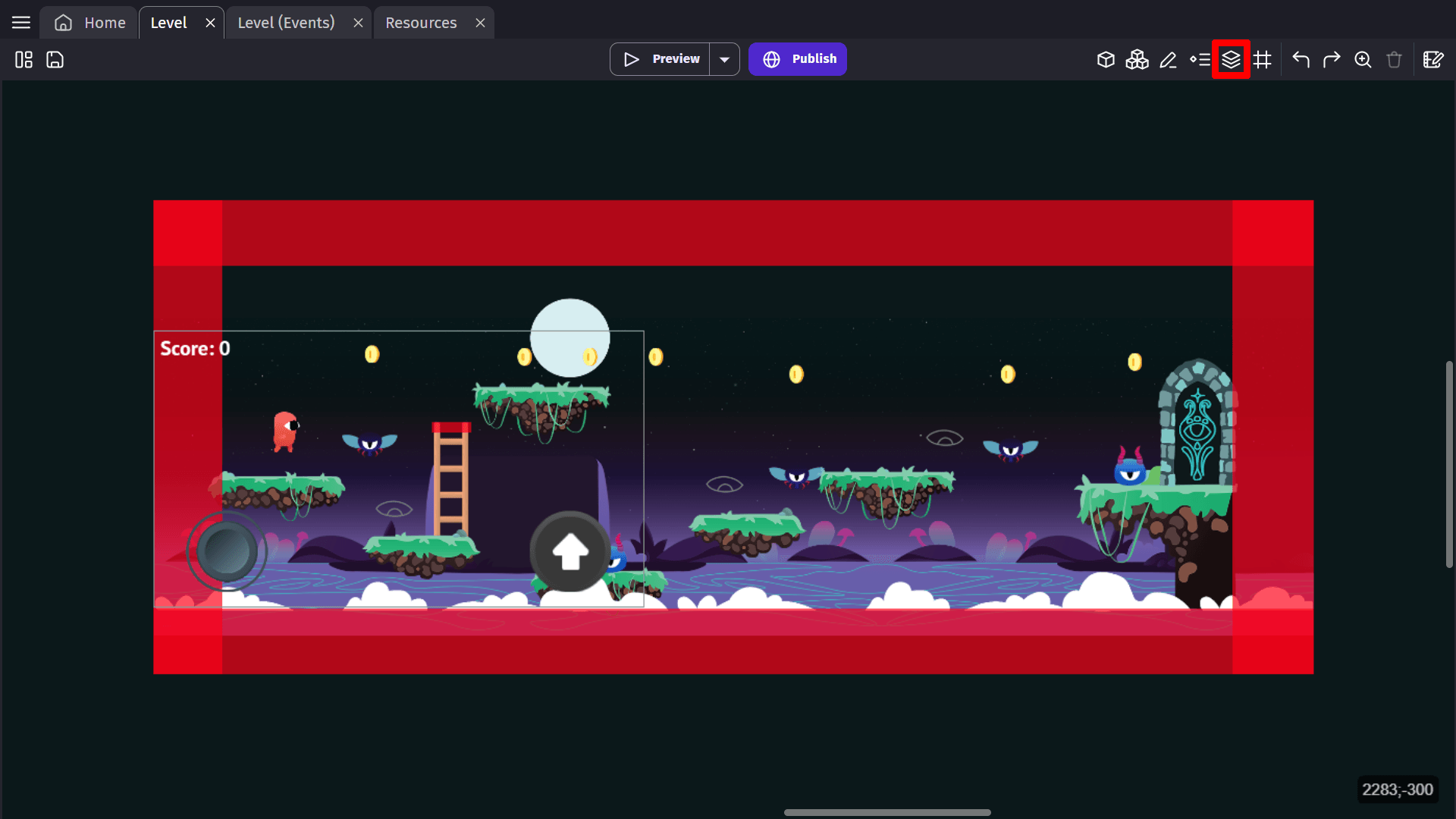 - The camera of the layer stays centered when the game window is resized. This is usually useful for game content or menus