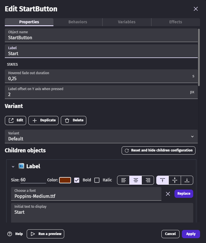 - Open the object editor and duplicate the default variant by clicking on the Duplicate button below the Variant title.