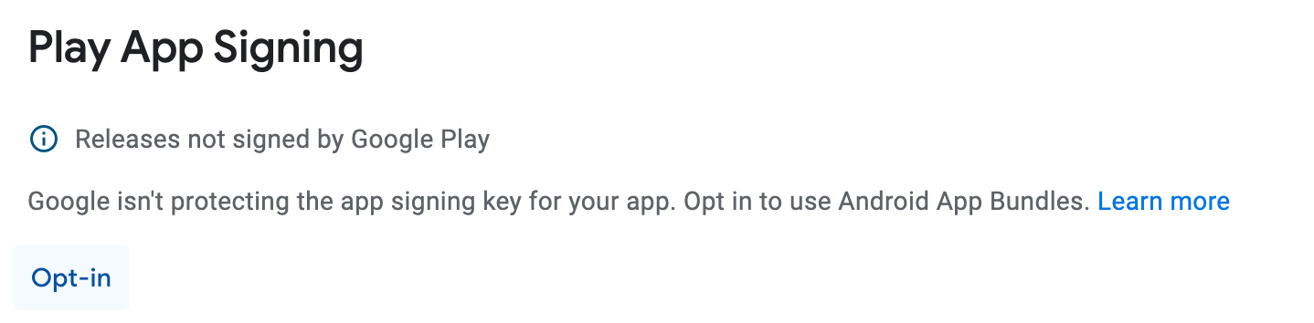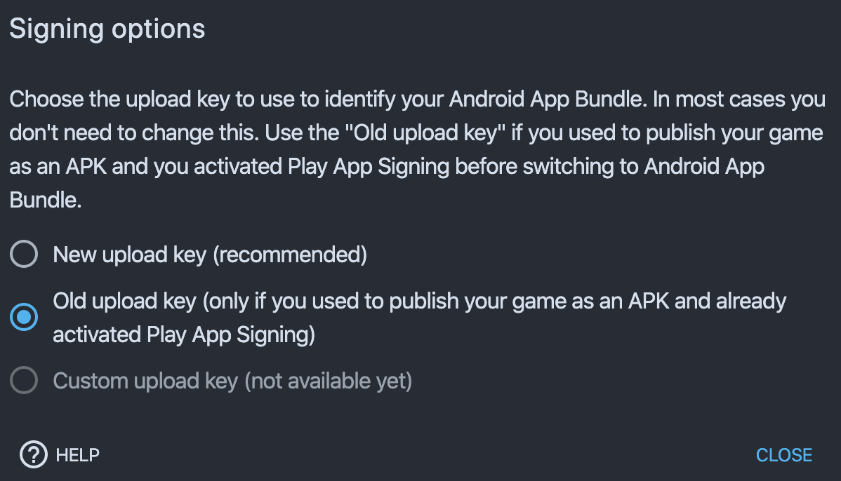 It means that you're already using Play App Signing for your game (if not, go to next section). If you've only published your game in the past as an Android App Bundle, there is nothing to do. But if you've already published your game as an APK in the past, you need to build the Android App Bundle using the old "upload key" that was used for your APK.