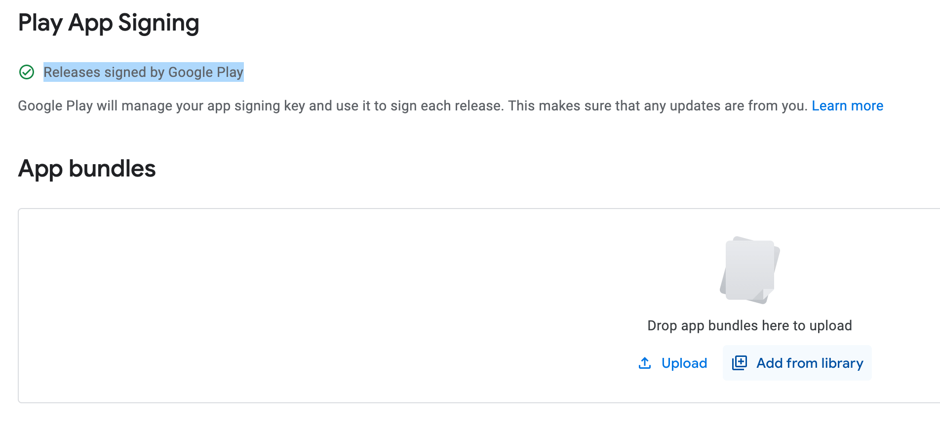 You should see in the screen to upload the Android App Bundles something indicating "Releases signed by Google Play". Click on Upload and choose the Android App Bundle (.aab) file that was generated by GDevelop: