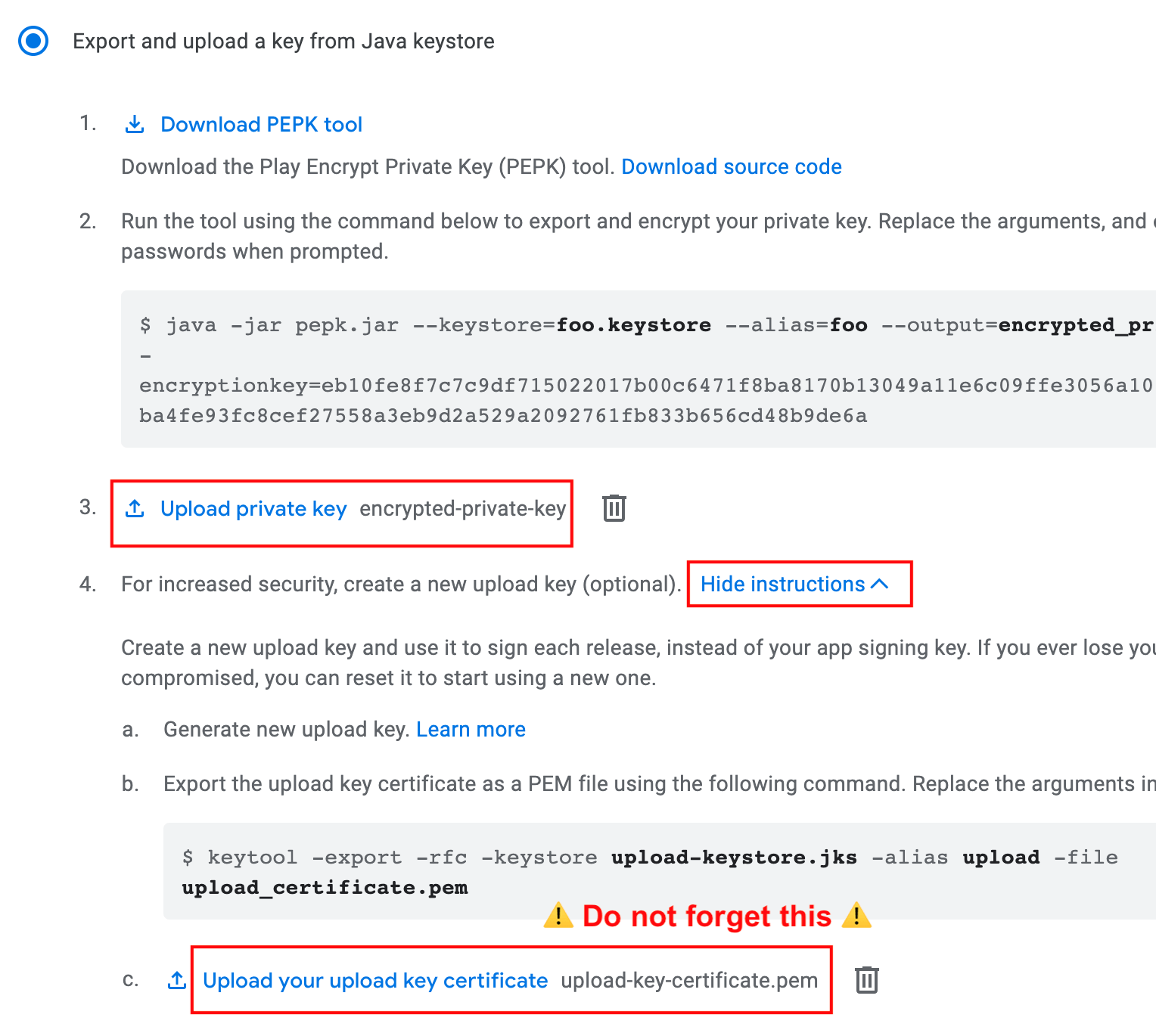 It's important that you properly set the two files. If you don't set the proper upload key certificate, you will have to use the "Old upload key" for every packaging (see previous section).