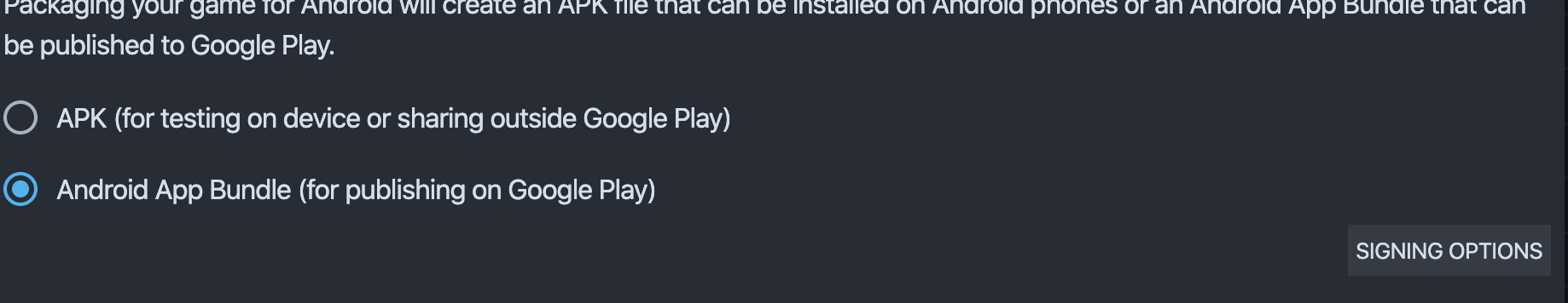 For this, in GDevelop, before packaging your game, make sure to go to "Signing Options":