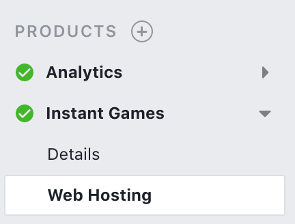 Go back to Facebook Developers and choose Web Hosting in the Instant Games menu: