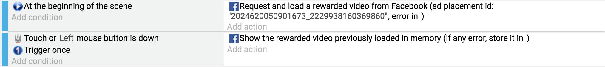- Add an action "Load and prepare an interstitial ad" (in "Facebook Instant Games", "Ads").