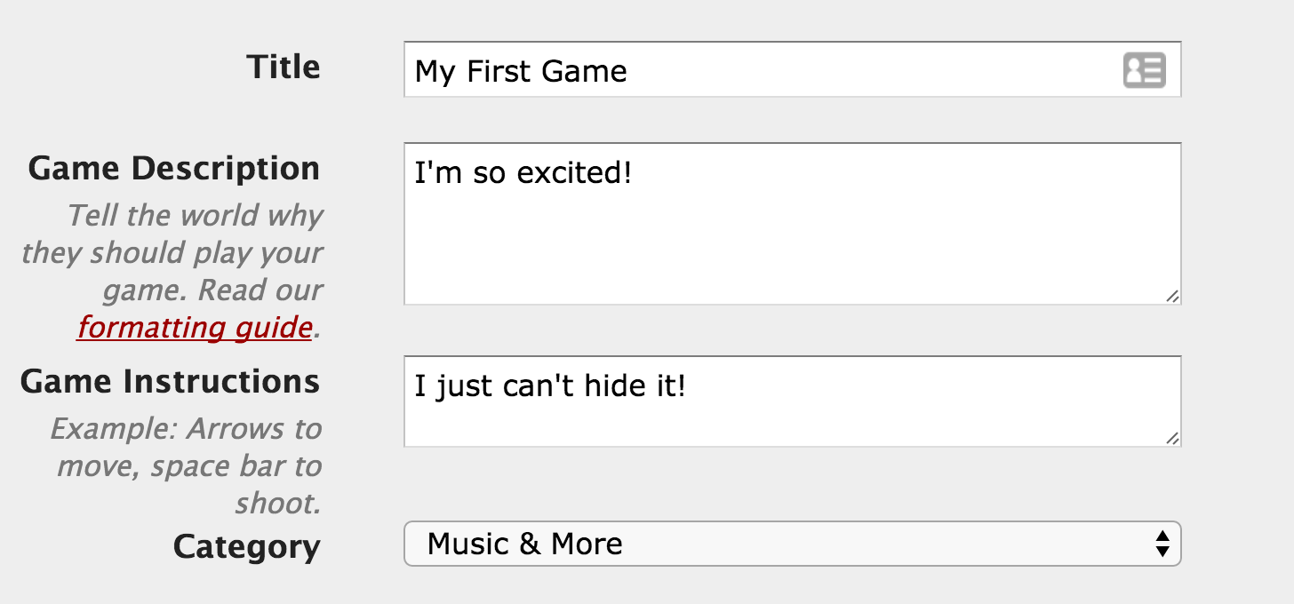 - Bug Reports: We can add a "report a bug" button next to your game and send them via email to you. If you select this you will have the option to specify the target email address.