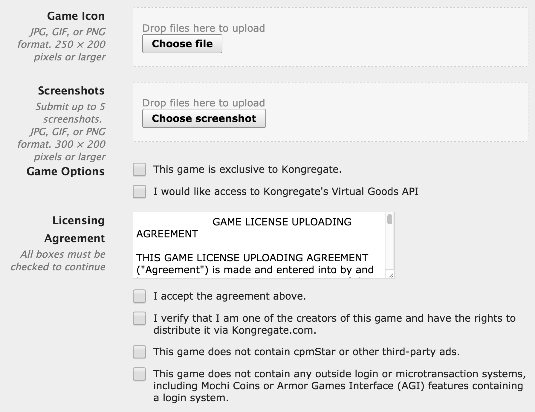 Games can only be uploaded by their legal owner, and all uploaders must agree to Kongregate's Game License Uploading terms.