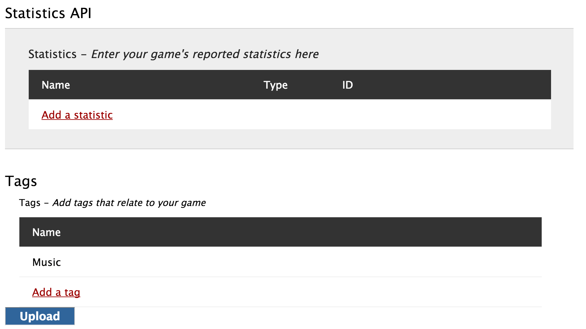 Finally, you'll have the option to specify some Statistics(Any event in your game can be submitted to Kongregate as a score) for your game and add some Tags that help users locate your game based on interests. You can learn more about Statistics here. Let's leave it empty for now. Add one or more tags that you find suitable for your game.