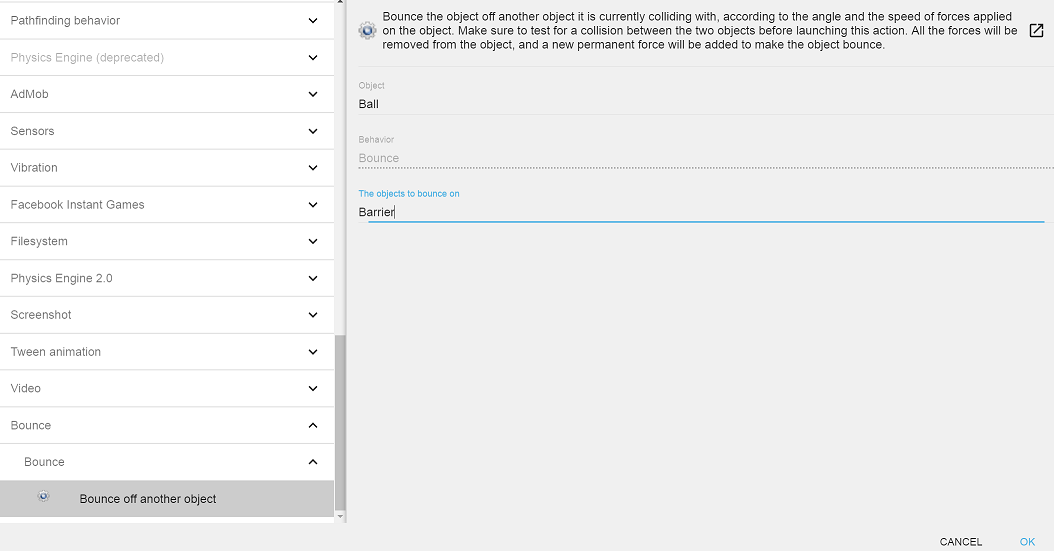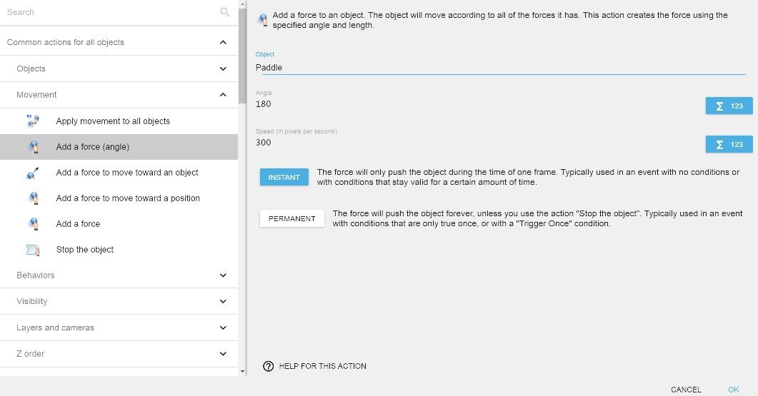 - Click Common actions for all objects > Movement > Add a force (angle).