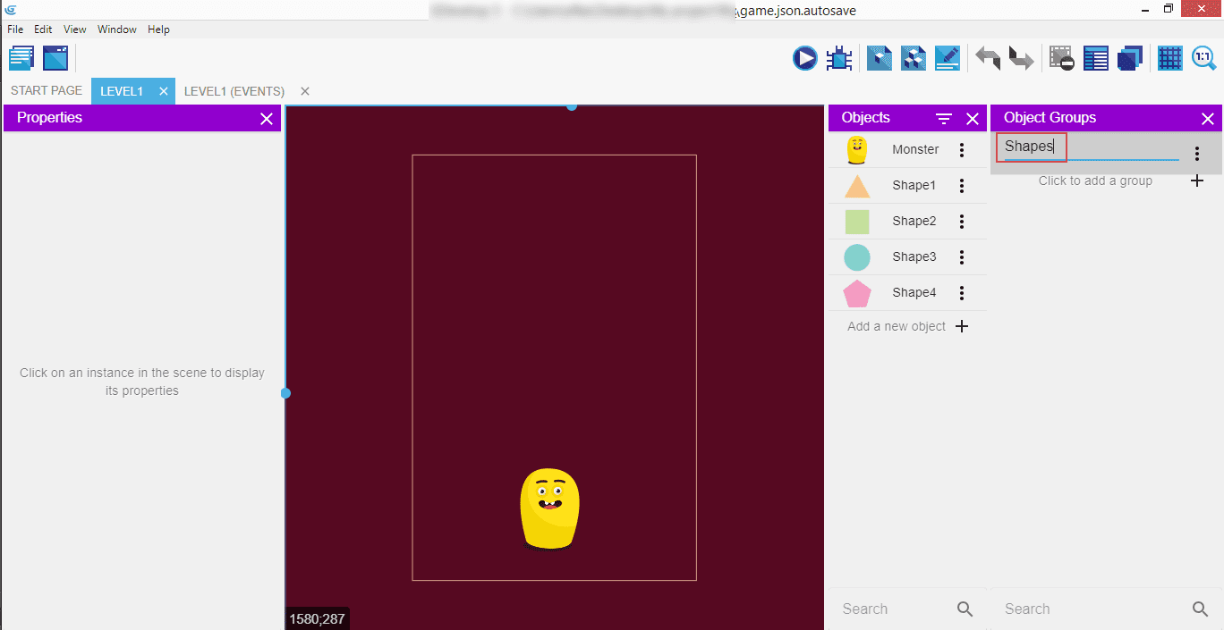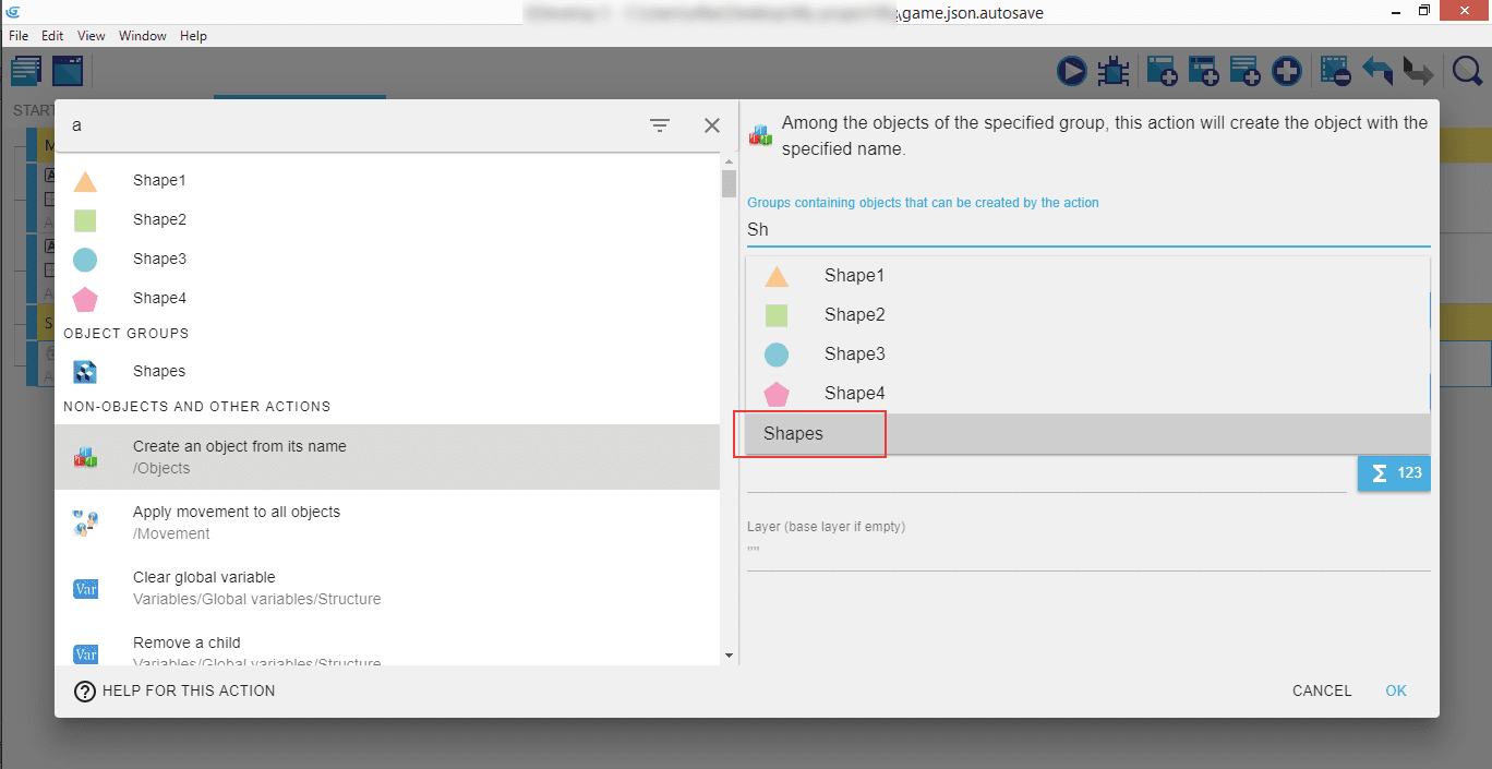 The three values we will enter are: "Text representing the name of the object to create", "X position", and "Y position". Name it "Shape" + ToString(RandomInRange(1,4))