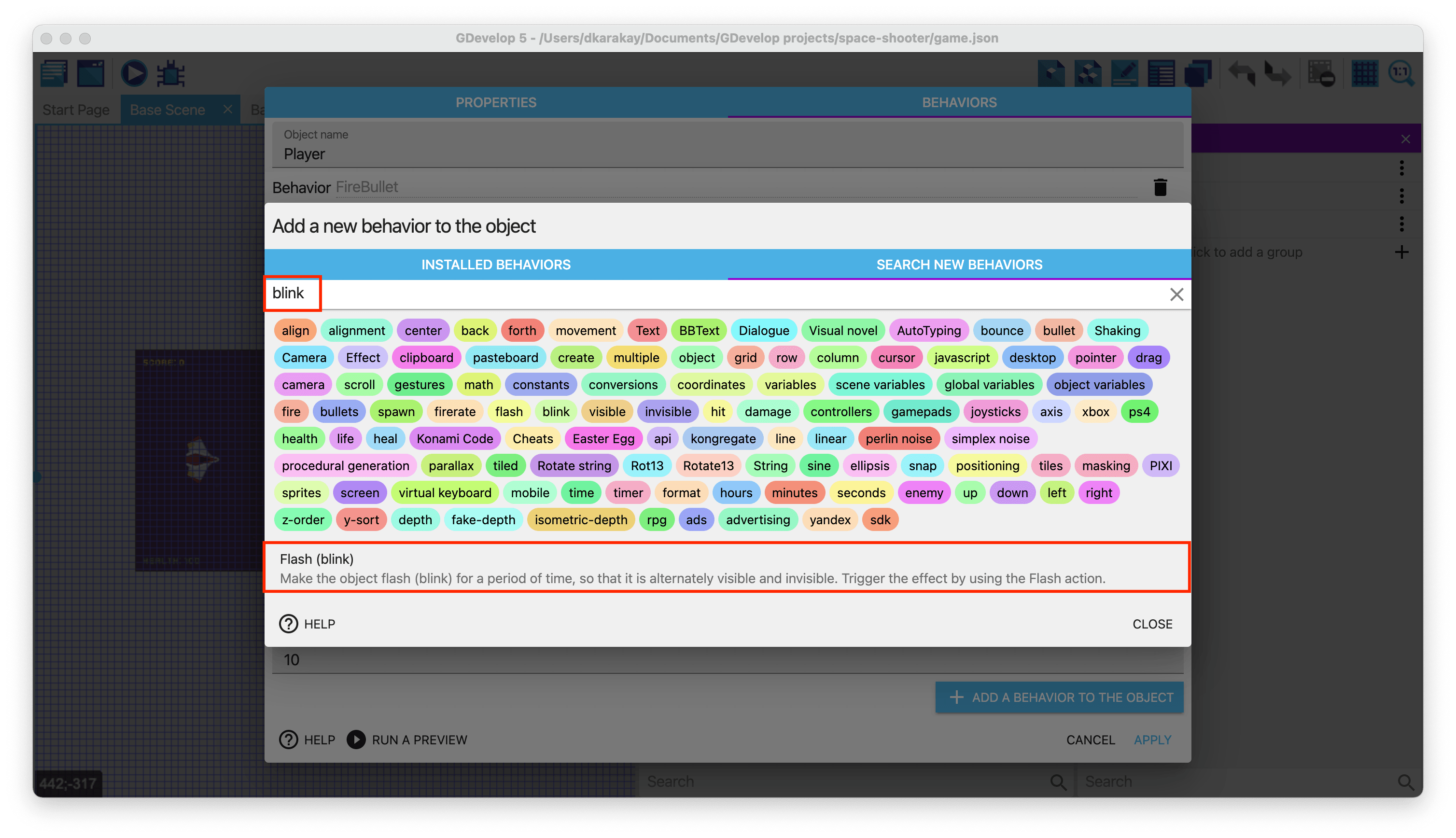 We will use a blinking effect for the player when the player gets damaged. In GDevelop, there is a behavior for blinking, so go to the player's behavior settings. Then search "blink" to install the action called Flash.