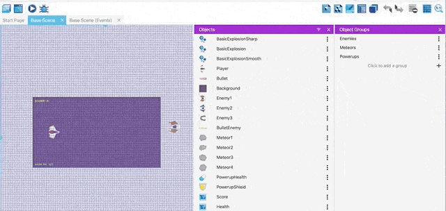 Add a new action to create these explosion objects. Select BasicExplosionSharp and choose create an object. Fill X position with Enemies.X() and Y position with Enemies.Y().