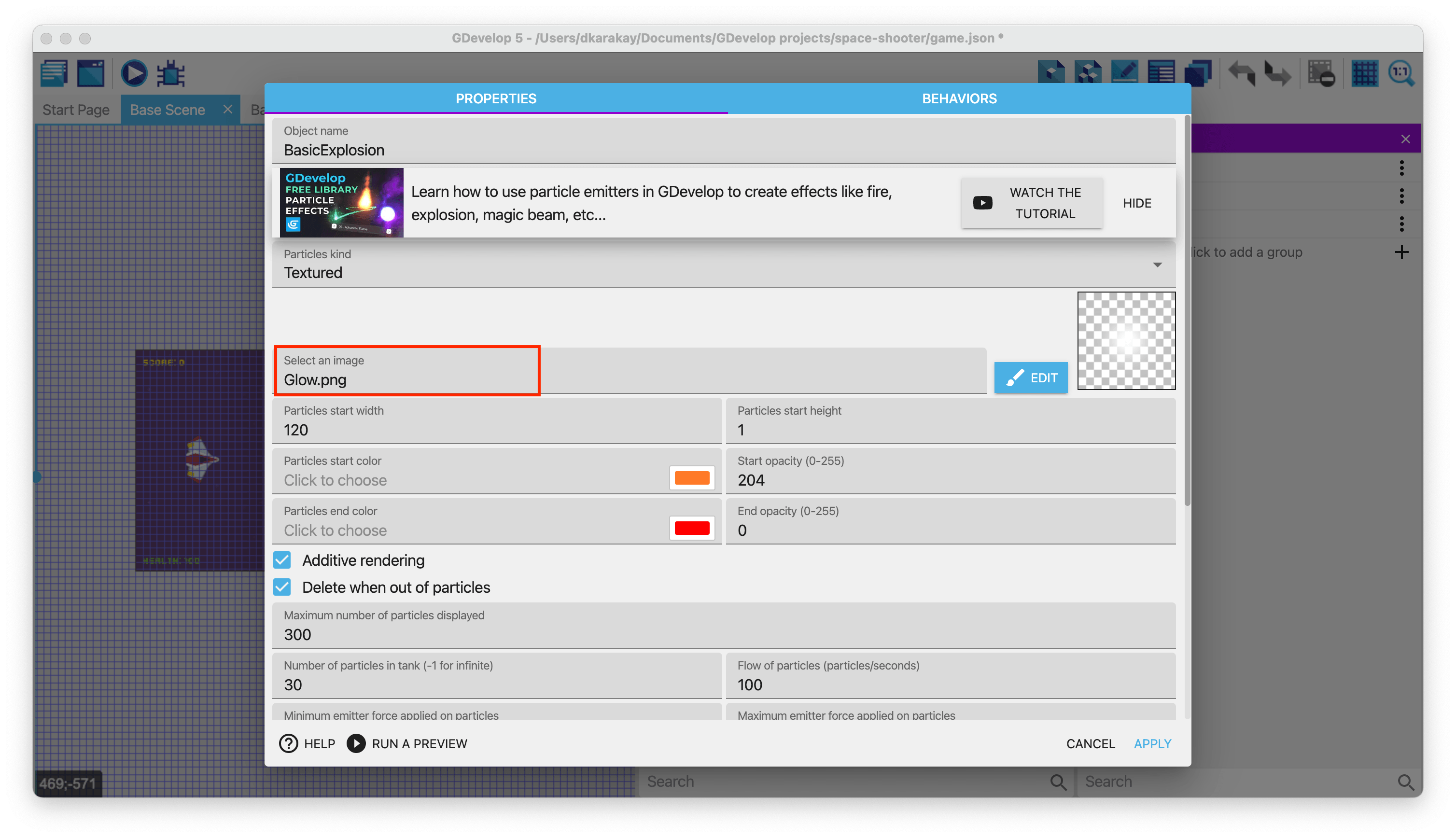 Repeat the same process for BasicExplosion. This time, choose Glow.png from the assets folder.