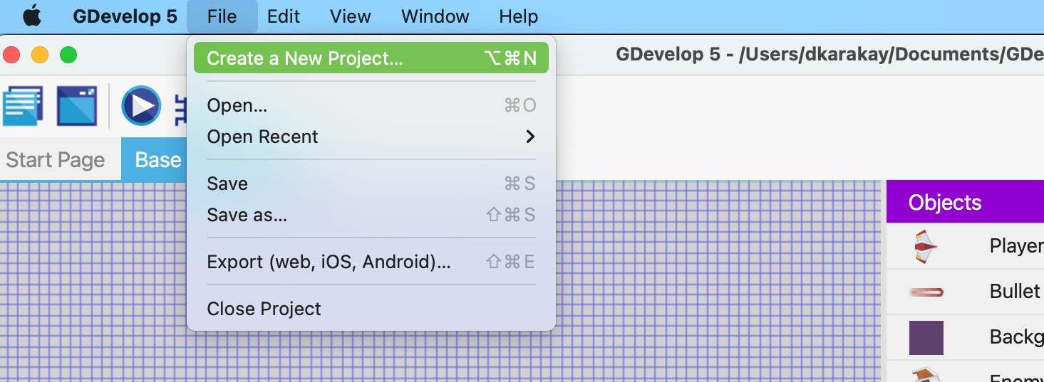 We will use a sample project of GDevelop to copy an explosion effect and put it in our game. Go to File and Create a new project.
