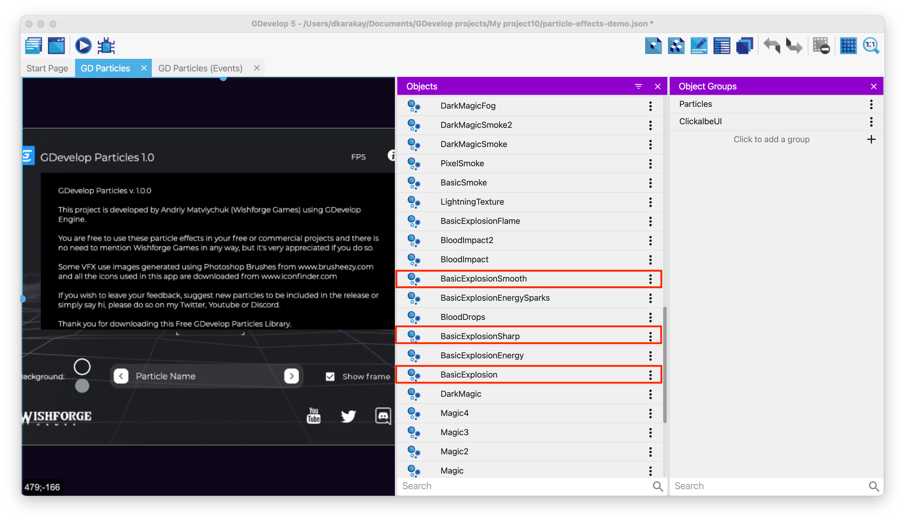We will copy three objects (BasicExplosion, BasicExplosionSmooth, and BasicExplosionSharp) to our Base Scene and use them in our game.