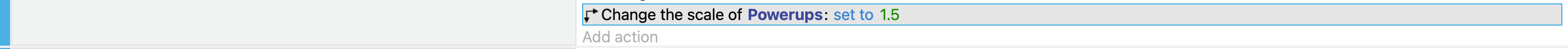 Create a new condition for detecting the collision between the Player and the PowerupShield objects. Then, add an action to change the animation of the player. Select Player, and choose "Change the animation (by name)" and enter "PlayerShield" in the name field.