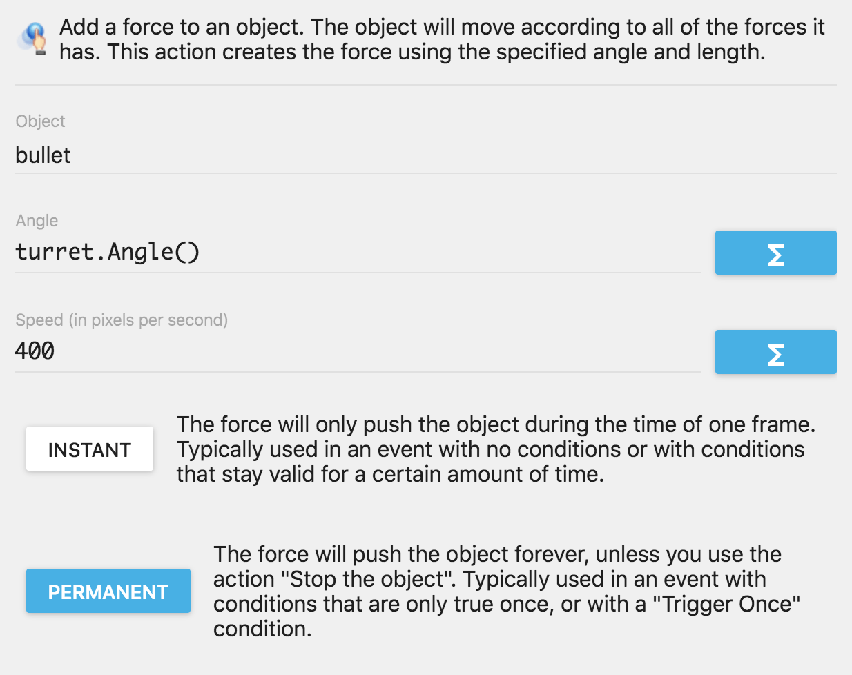 For the "Angle of movement", we'll put the same angle as the turret. Enter "turret.Angle()" in the 2nd parameter. For the 3rd parameter, enter "400". The bullet will move with a speed of 400 pixels per seconds. Finally, click on the "Permanent" option. This last parameter tells to the force to be constantly applied to the bullet. After the movement is started, this parameter keeps the bullet moving.