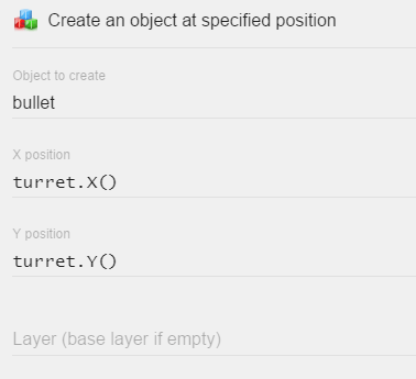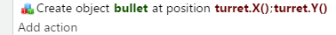 The only thing is left to do is to tell GDevelop to fire the bullets from the "Canon" point of the "turret" object. So in our "create bullet" action, we need to change turret.X() and turret.Y() expressions, to turret.PointX("Canon")