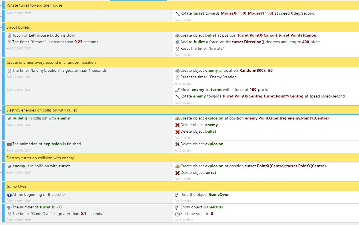 We are now going to create the "Events" used to animate the entire game. In the first event, the "turret" must be rotated toward the player's mouse.