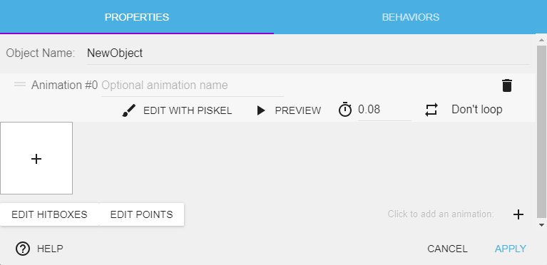 First, create a sprite object. Select "Sprite" from the popup list. Next, the object properties panel will be displayed. If you don't see the properties panel, right click on the NewObject in the Object editor and select "Edit object" from the popup list there.