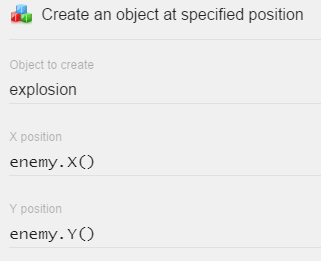 Add an action to create the explosion object in the same way that we created the bullets and the enemies. For X and Y position, use the expression enemy.X() and enemy.Y(). This expression is going to get the X and Y position of the enemy object that is in collision with the bullet.