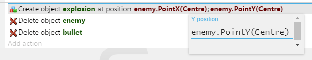 Finally, instead of creating the "explosion" object at the "Origin" point of the "enemy", it is necessary to create the object at the Centre Point. Change the expression in the create explosion action from enemy.X()