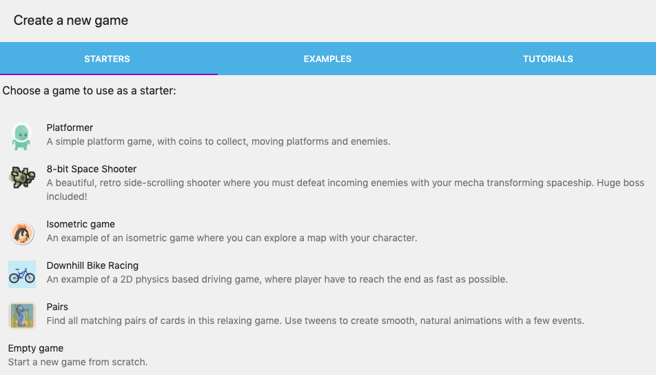 There are also lots of examples and templates bundled with GDevelop! You can find more by visiting: gametemplates.itch.io