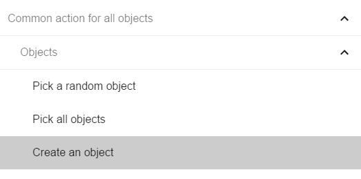 When “Create a new object” is selected, another list of choices will open on the right side of the selector panel. It displays the name of the action as well as the parameters for the action. Fill in the first parameter by selecting/clicking on “Object”.“bullet” will pop up from a list of the available objects. Select “bullet” from the list.