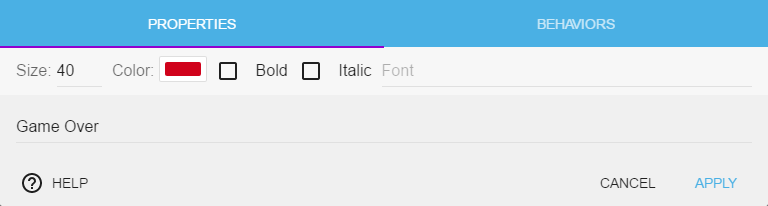 Now, change the text to "Game Over", the text color to red, and the text size to 40.