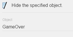 And what we want to do is show the text GameOver if there is no turret in the scene, so add the action Common action for all objects > Visibility > Show and for parameter we want to select the GameOver object.