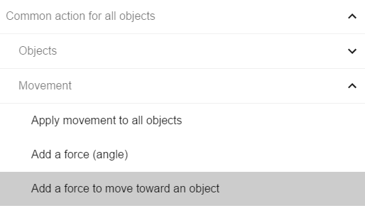 This time, choose the action called "Common action for all objects" "Movement", "Add a force ( Angle )".